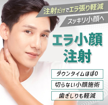 ボツリヌス注射を用いて顔のエラの張りを改善する治療。通常より3倍量を注入することで、筋肉の収縮を抑え小顔効果を高め、自然でシャープなフェイスラインを作る施術。