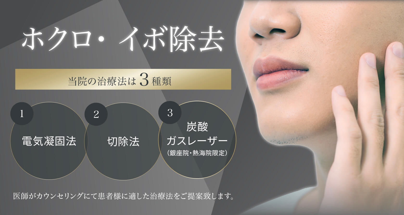 ほくろやいぼ、タトゥーを除去。大きさや範囲により、レーザーで焼灼する、メスで切開するなど対応が異なる。完全に除去するまで複数回の治療が必要な場合もある。